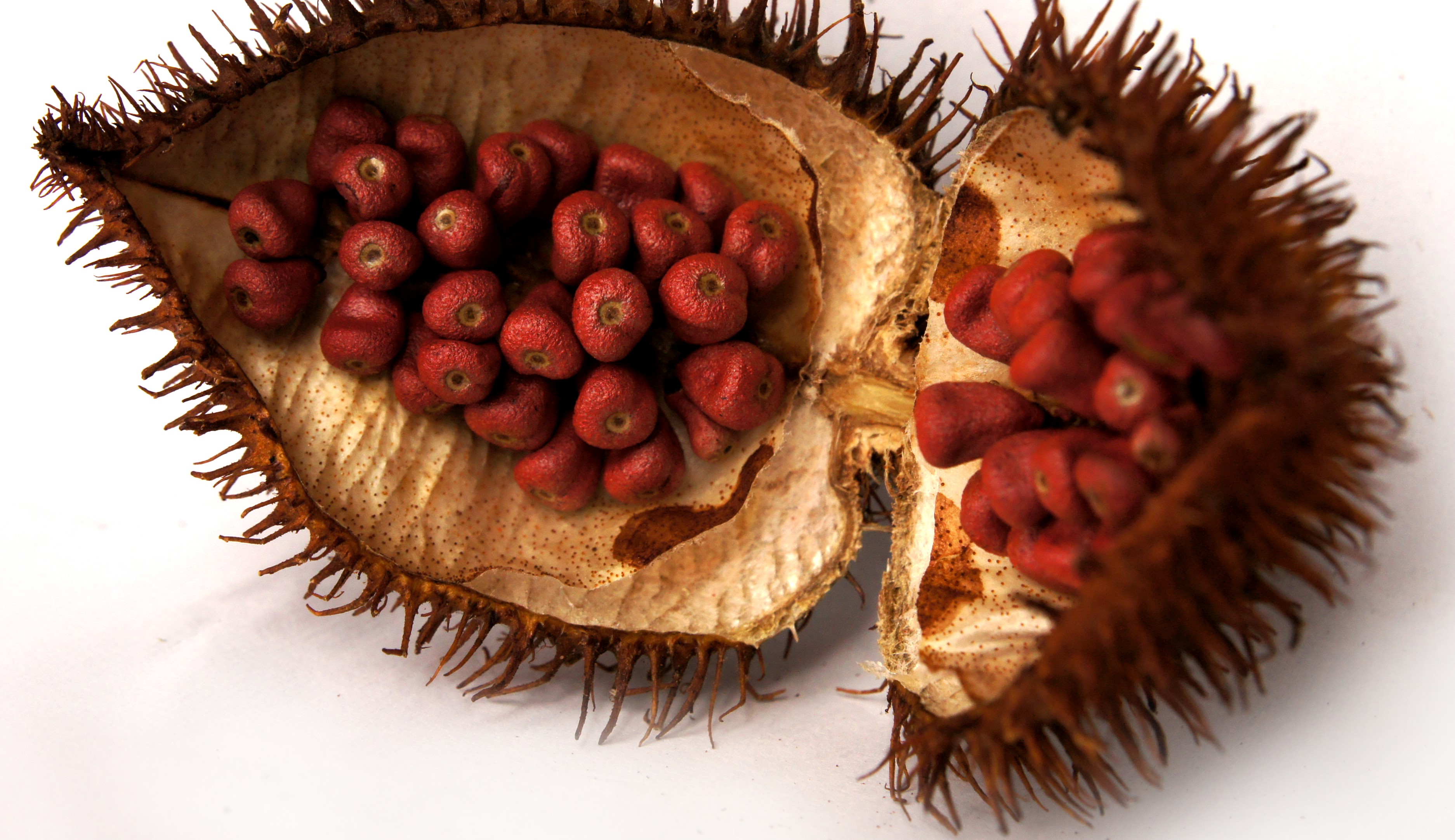 I de tropiske skogene i Amazonas vokser det et tree som hvert år produserer en frukt som minner om små kastanjer i skallene. I det piggete skallet skjuler det seg dyprøde frø som brukes for å utvinne roucouoljen. Disse inneholder ikke mye olje, så for å presse en liter roucouolje trenger man mange frø.